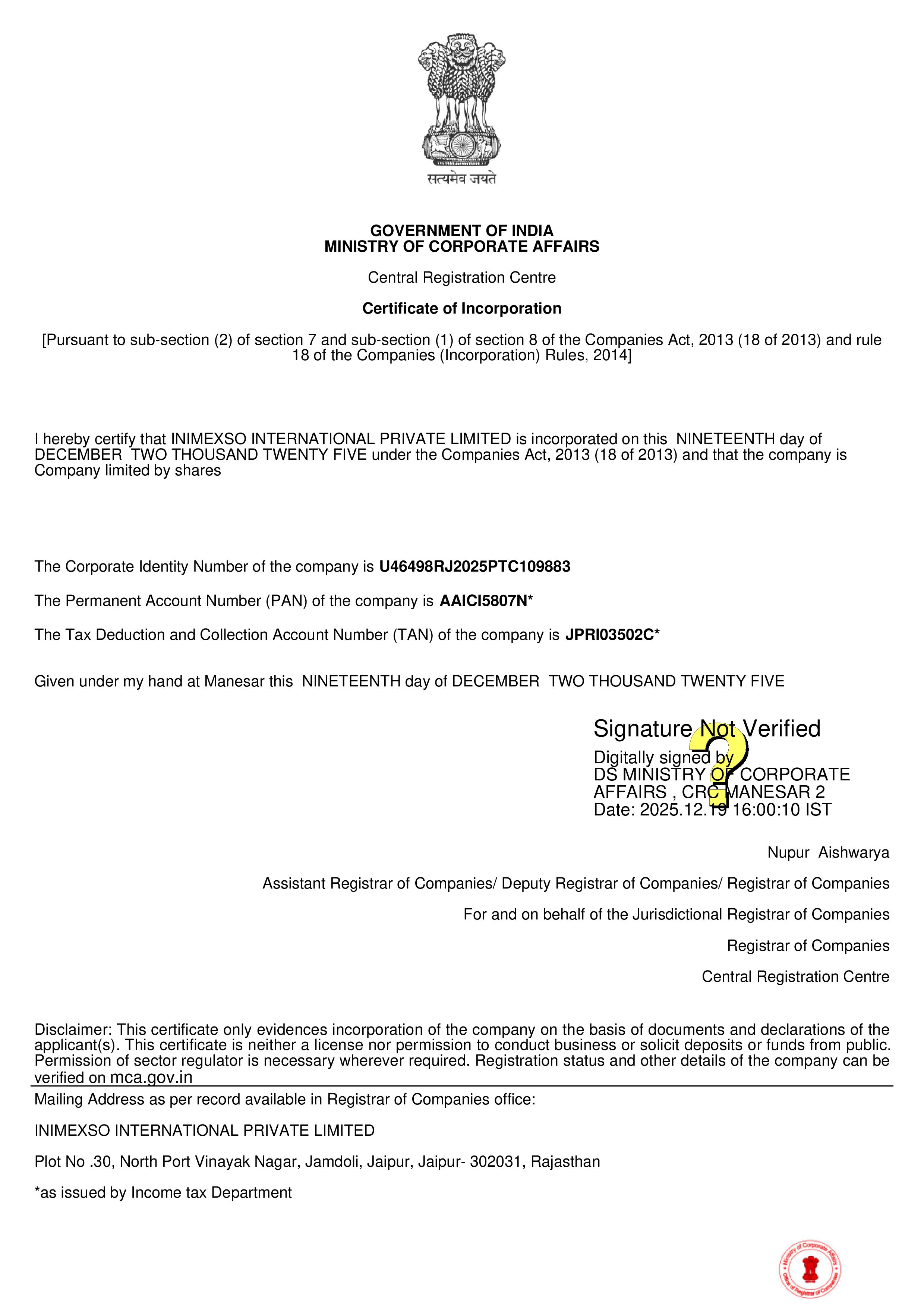 Certificate of Incorporation